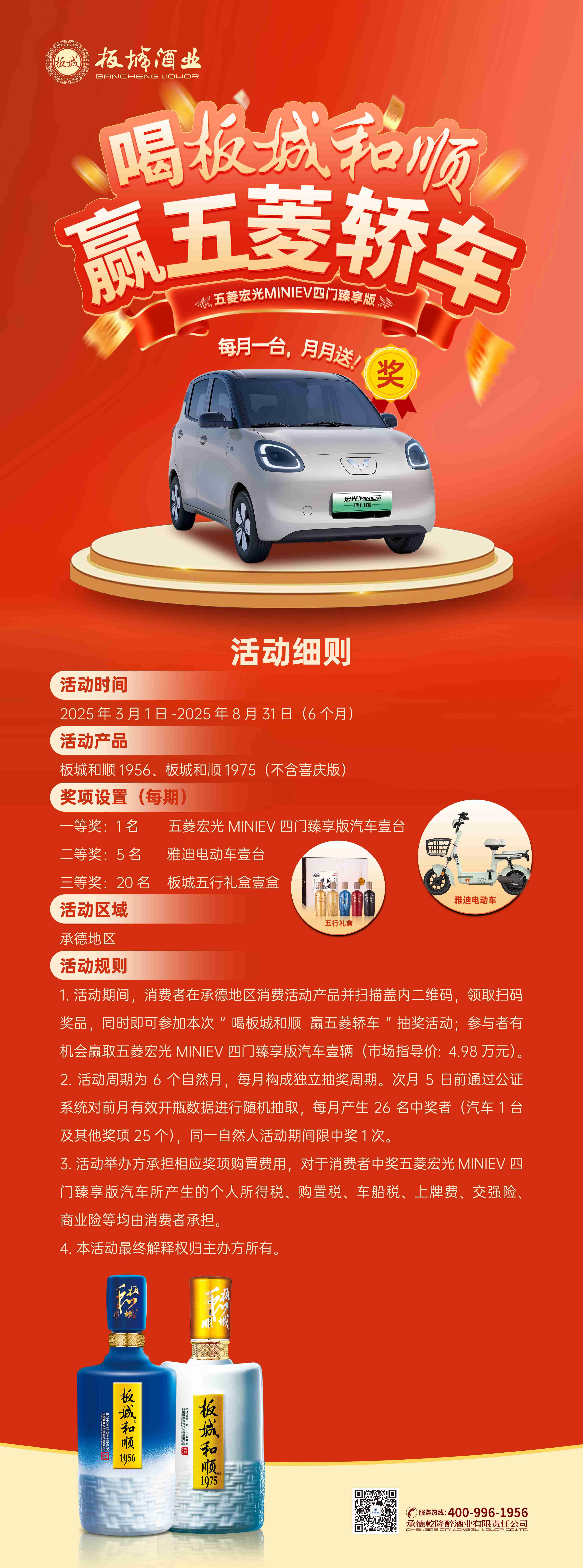 消費(fèi)者在承德區(qū)域購買板城和順1975、板城和順1956(不含喜慶版)產(chǎn)品后,掃描瓶蓋內(nèi)二維碼,即可自動參與抽獎(jiǎng)。掃碼用戶除享受原有掃碼獎(jiǎng)勵(lì)外,還可額外獲得贏取五菱宏光MINIEV四門臻享版汽車、雅迪電動車等重磅獎(jiǎng)品的機(jī)會。